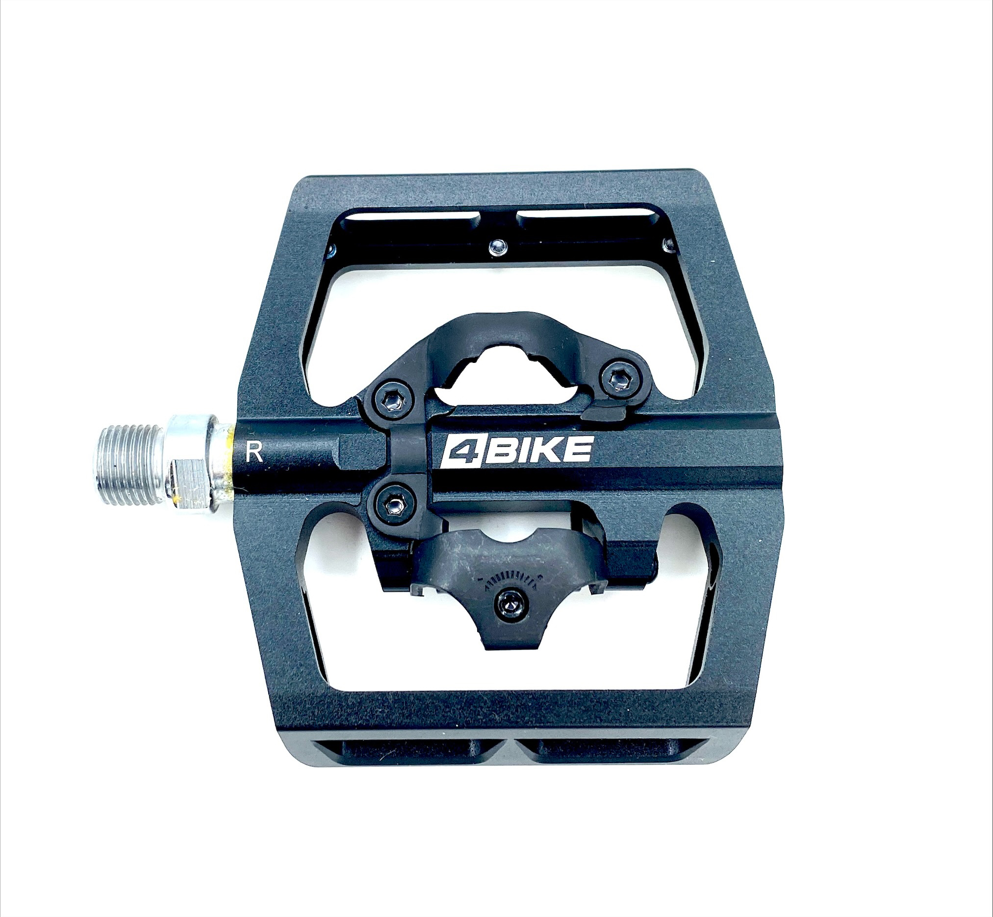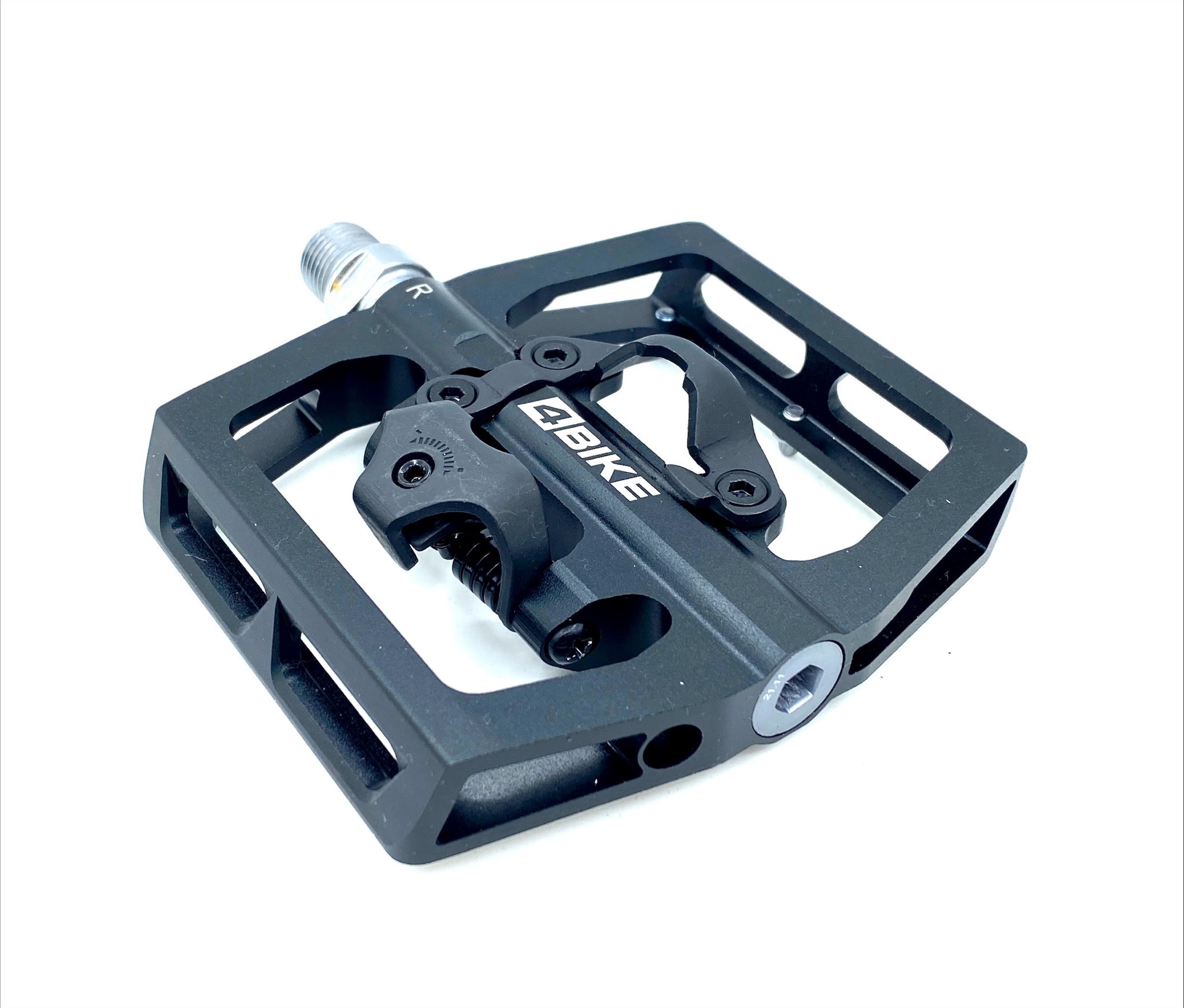 Контактные велопедали 4Bike PD15. SPD совместимые. Комбинированная конструкция, с одной стороны классическая платформа, с другой контактный механизм. Регулировка жесткости встегивания и выстегивания. Размер платформы 103х98х30 мм, конструкция на промышленных подшипниках, материал платформы кованный алюминий, ось Cr-Mo, вес 448 грамм (пара). В комплекте с шипами.
