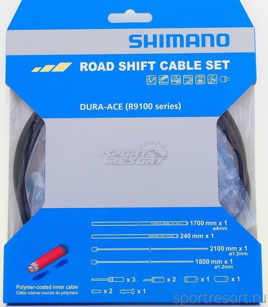 Комплект тросов с оплеткой для переключателя Shimano Road Dura-Ace R9100, 2 троса 1.2X2100 мм и 1800 мм с полимерным покрытием, оплетка SP41 1700 мм и 240 мм, заглушки оплетки и концевики для тросов.
